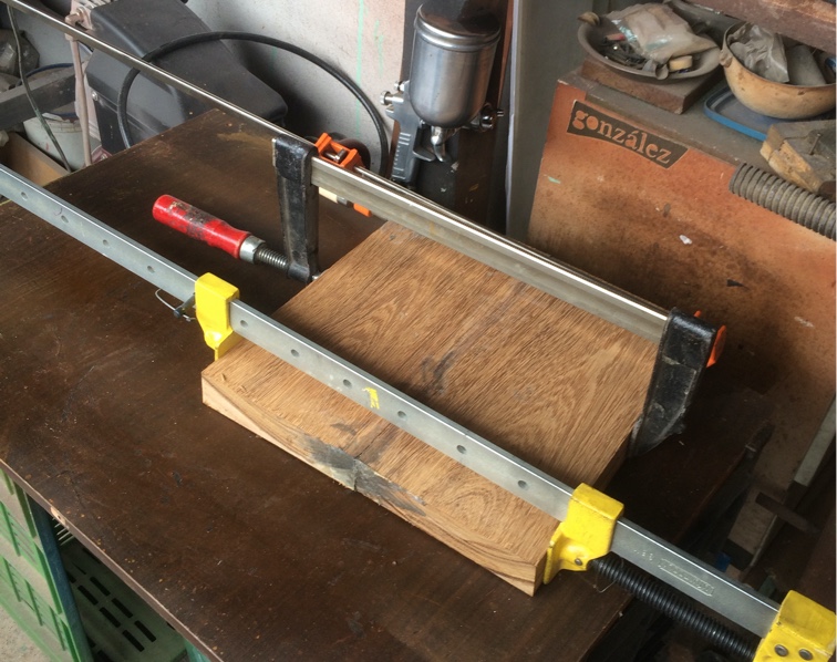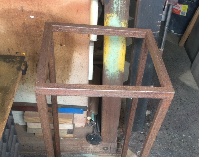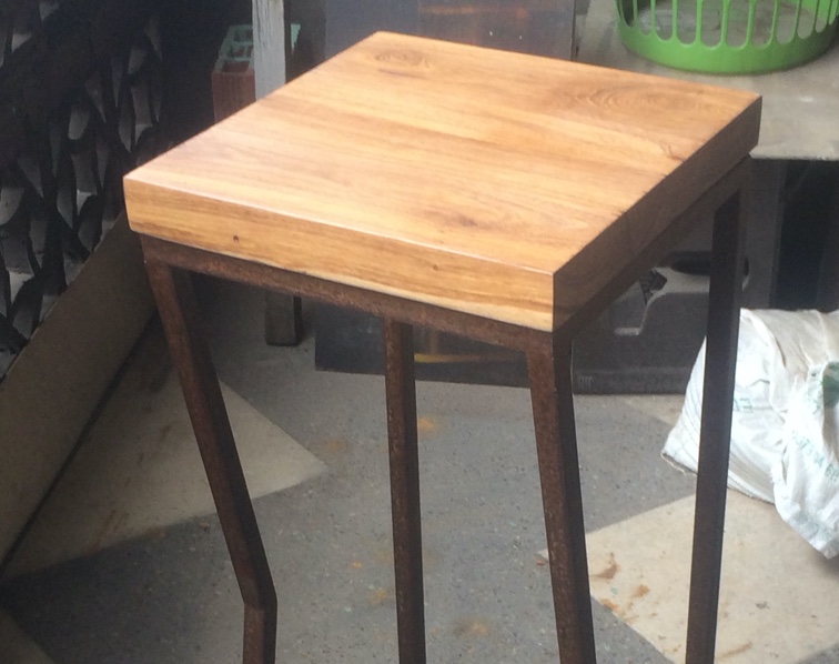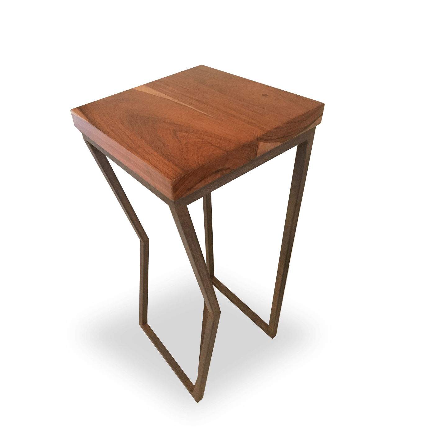 Elaborada con retal de madera sapán recuperada, unión de dos piezas pintadas con laca y base de acero con terminado rustico.