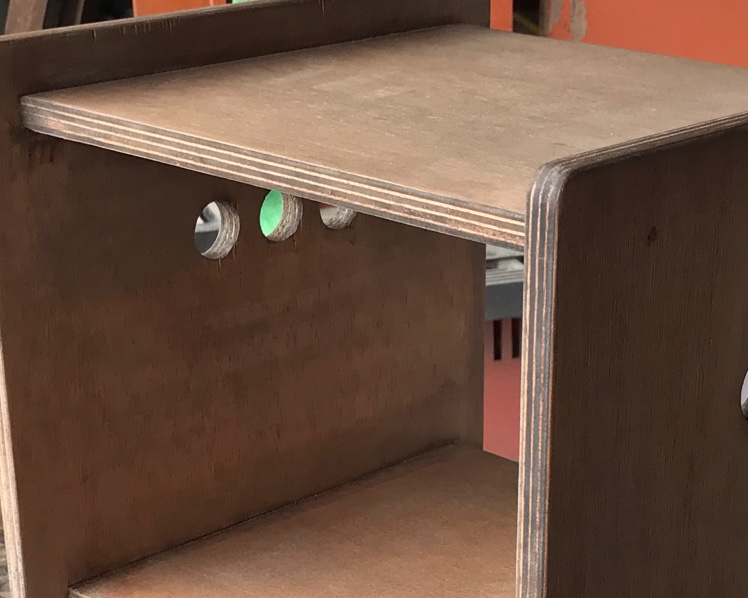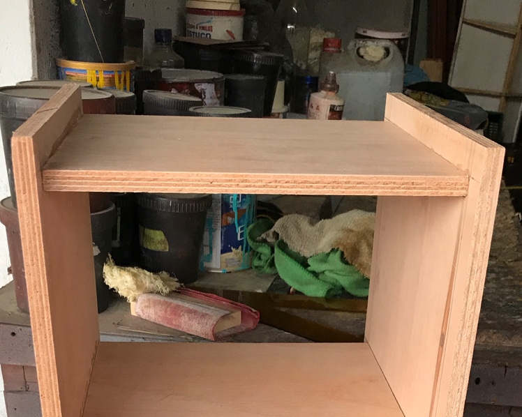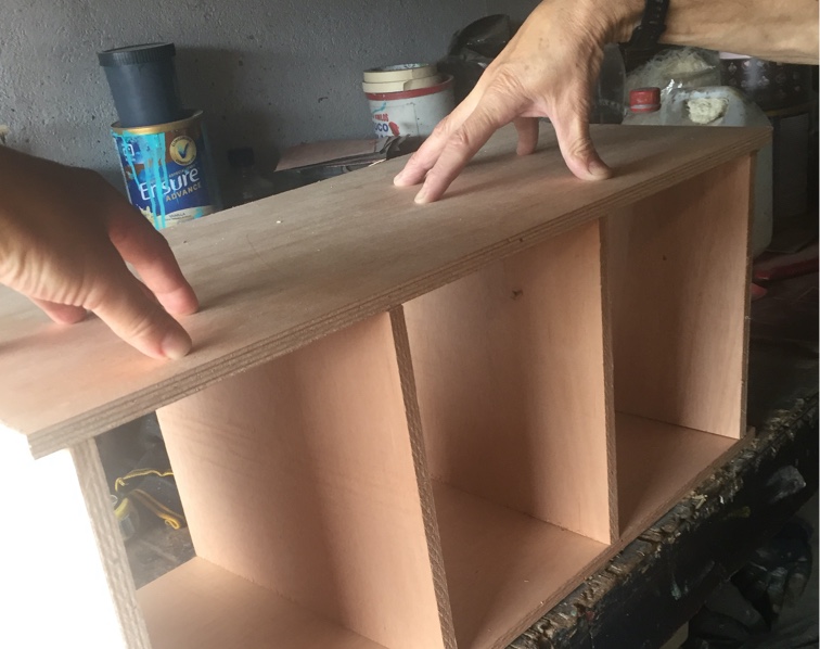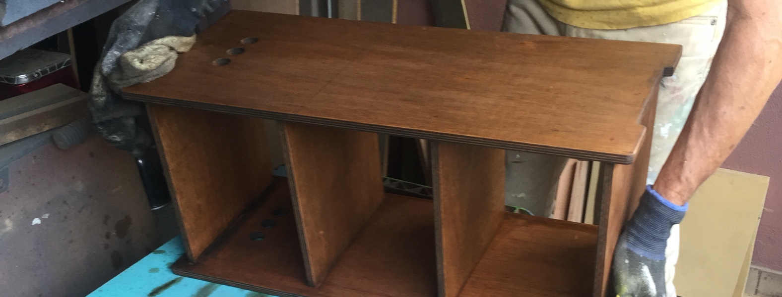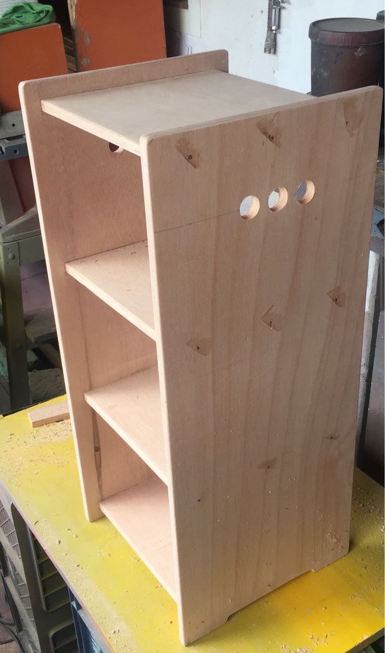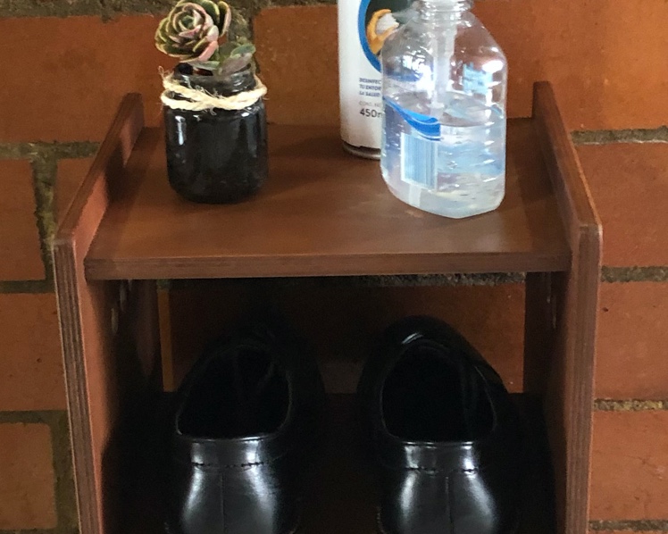Elaborado en madera contrachapada, cuenta con tres secciones para zapatos y una tapa superior para accesorios.